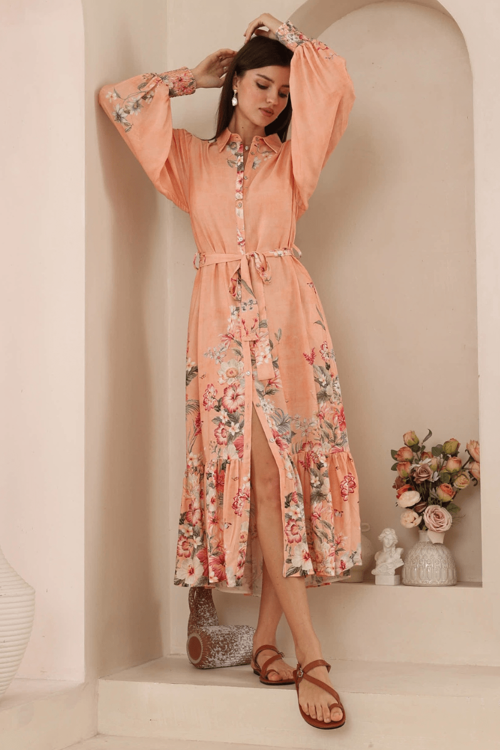 Adorned in a delicate peach floral print, this dreamy piece effortlessly transitions from day to night. Whether you're strolling through sunlit streets, heading to brunch, or dressing up for an event, the Eloise Midi Dress – Apricot is the perfect choice for every occasion.
