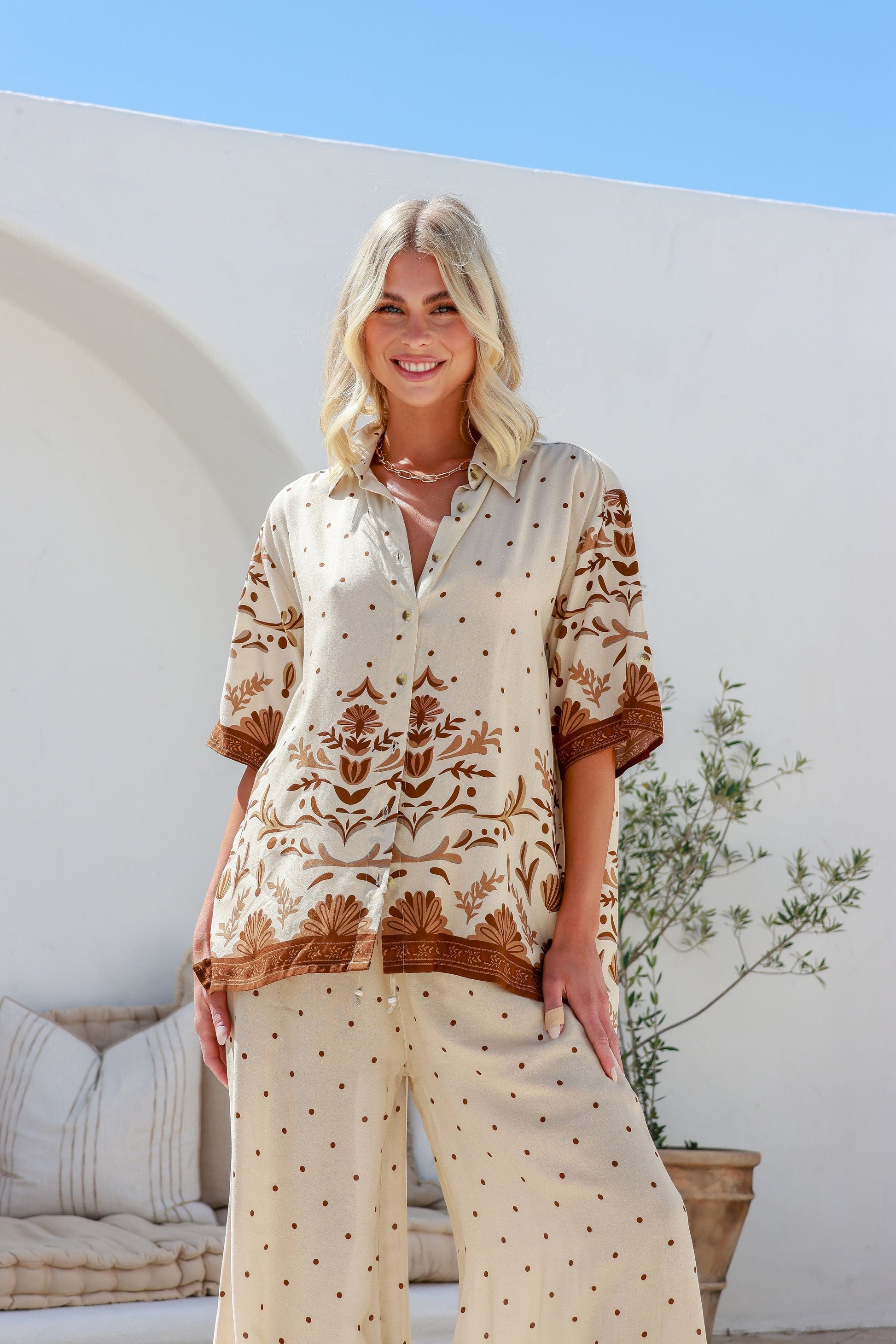 Introducing the Barcelona Button Shirt in sophisticated Latte by Joop & Gypsy – where comfort meets effortless style. Crafted from lightweight 100% Viscose fabric, this women's shirt is designed to elevate your everyday wardrobe with ease.