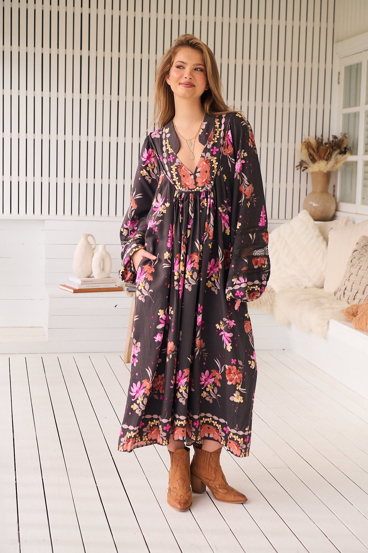 Discover your new favourite long sleeve midi dress — the elegant Boheme Midi Dress – Monarch Bloom from Jaase clothing. Featuring a flattering slimline silhouette with a romantic boho vibe, this dress combines everyday comfort with timeless style. The Monarch Bloom floral print, set on a classic black background with warm orange, pink, and yellow accents, offers a feminine edge to your wardrobe.
