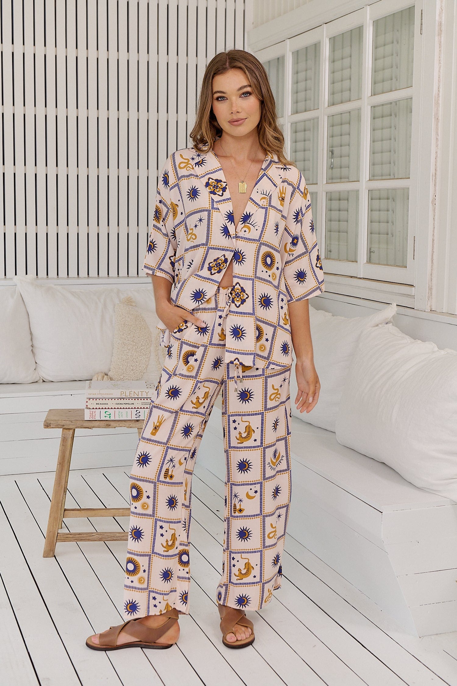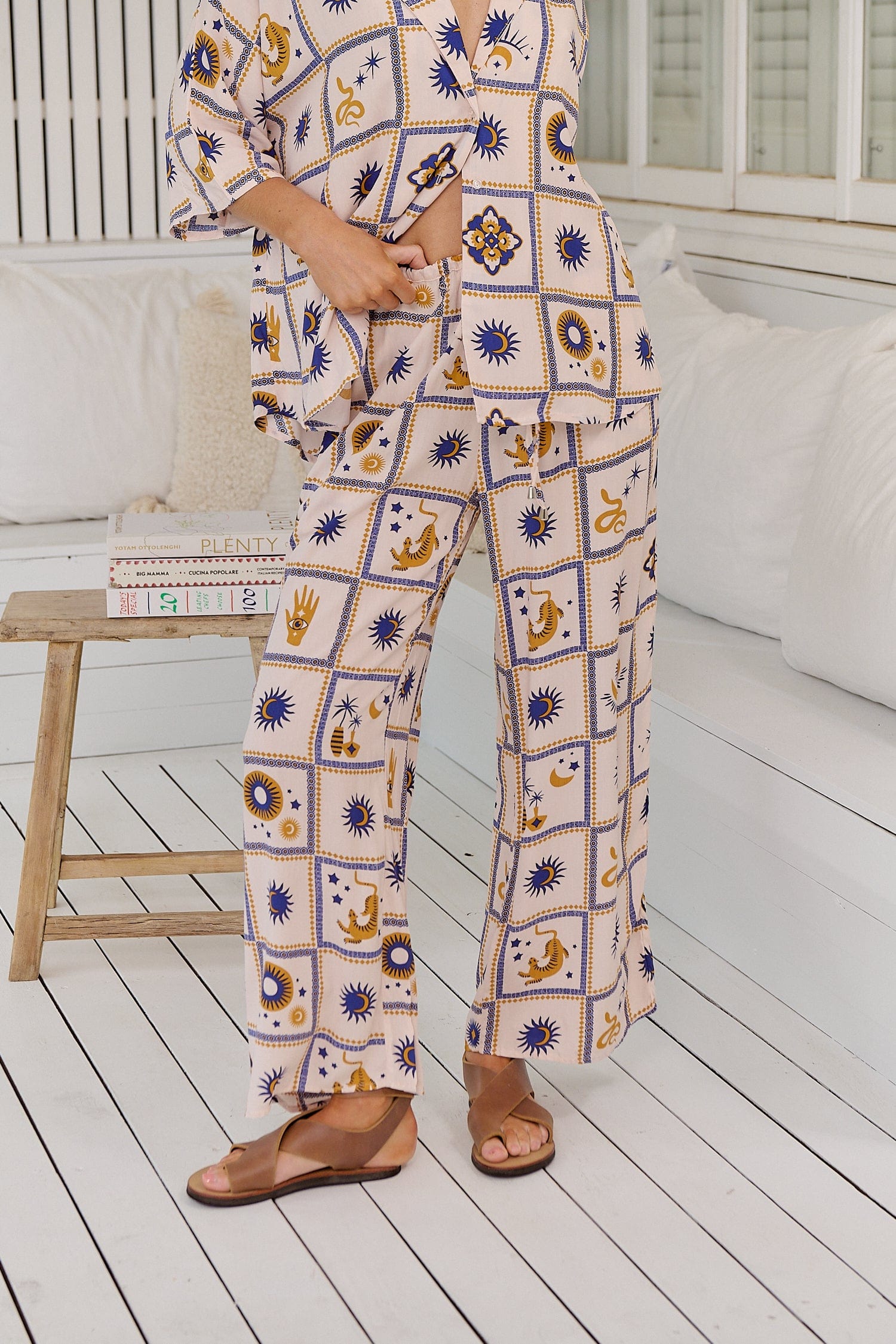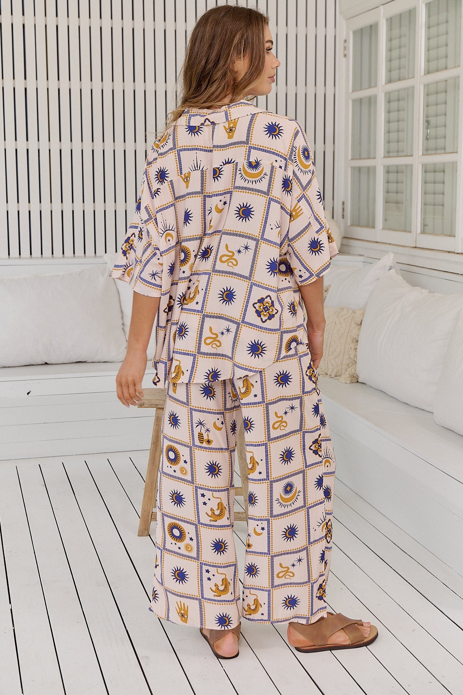 Introducing the Cici Pants - Oracle from Jaase, where effortless style meets unparalleled comfort. These relaxed, wide-legged pants are designed to be your new go-to for casual yet chic outfits. Featuring Jaase’s exclusive Oracle print, every square of fabric is a work of art, telling stories with intricate details of suns and moons, tarot hands, snakes, tigers, and more.