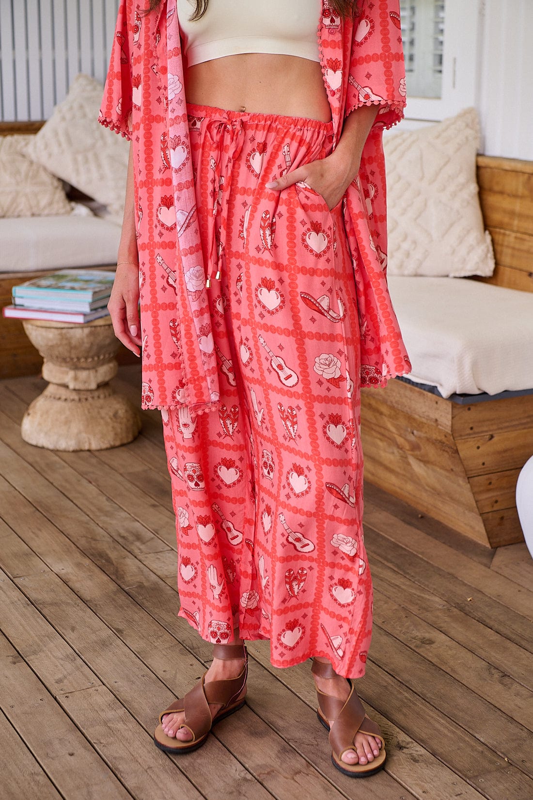 Drenched in a stunning cherry red hue, the Cici Pant complements the intricate Jaase Zamora print featured on the exclusive Jaase clothing line. The print showcases a captivating mix of guitars, roses, hearts, sugar skulls, feathers, and the mystical Tarot Hand, adding a touch of uniqueness to your ensemble.