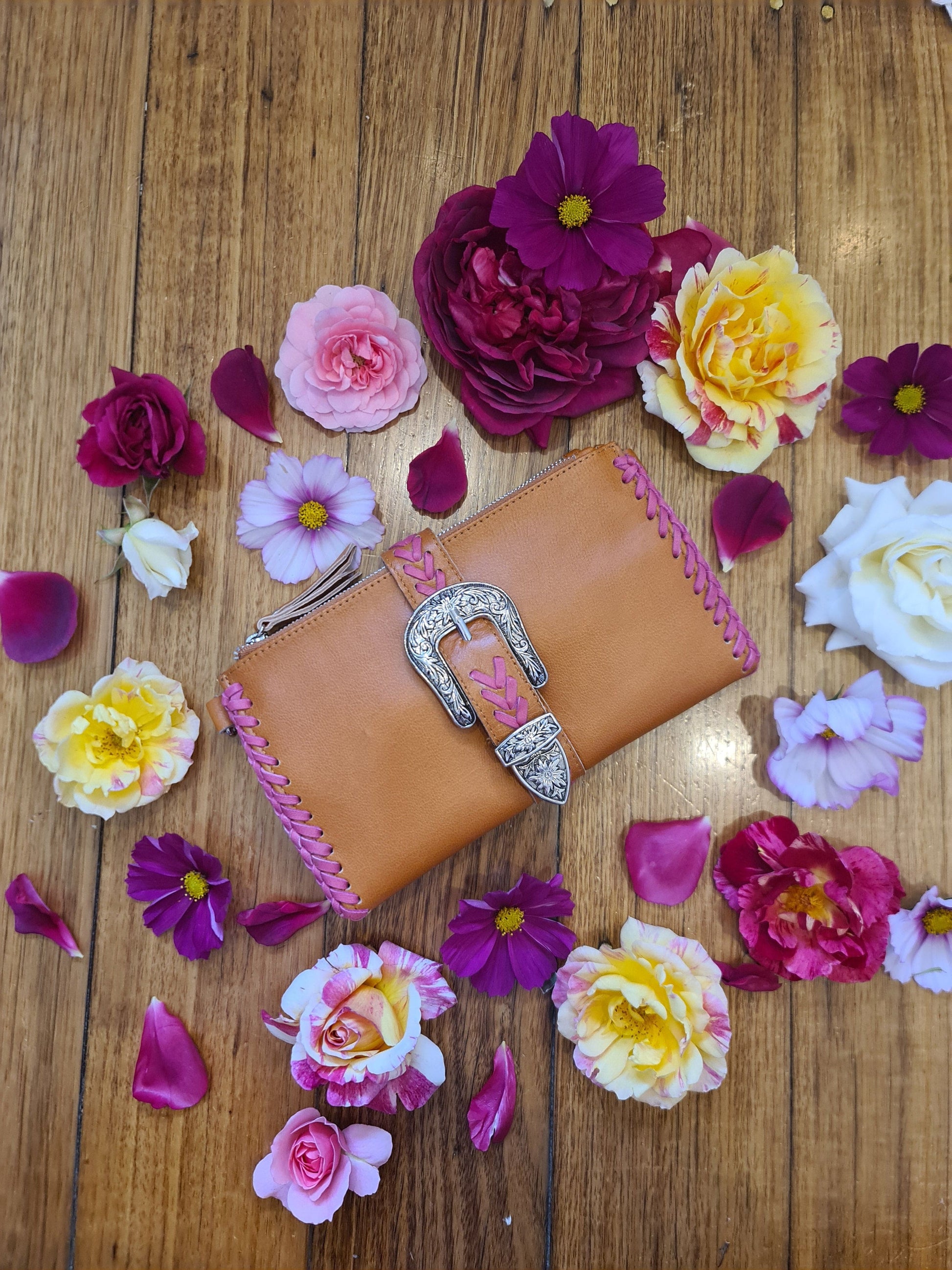 A bohemian leather wallet with a tan base and pink detailing, laid out on a surface surrounded by various flowers.