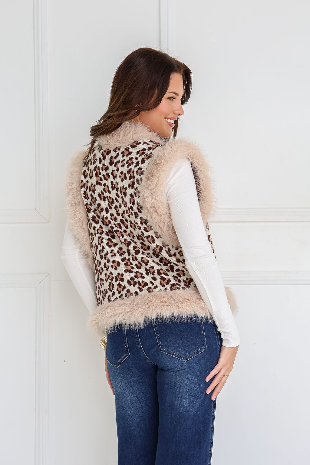 The vest features a striking leopard print knit, perfectly complemented by a lavish faux fur trim throughout, offering both warmth and luxury. Designed for the adventurous spirit, it effortlessly adds a touch of glamour to your everyday or evening look.