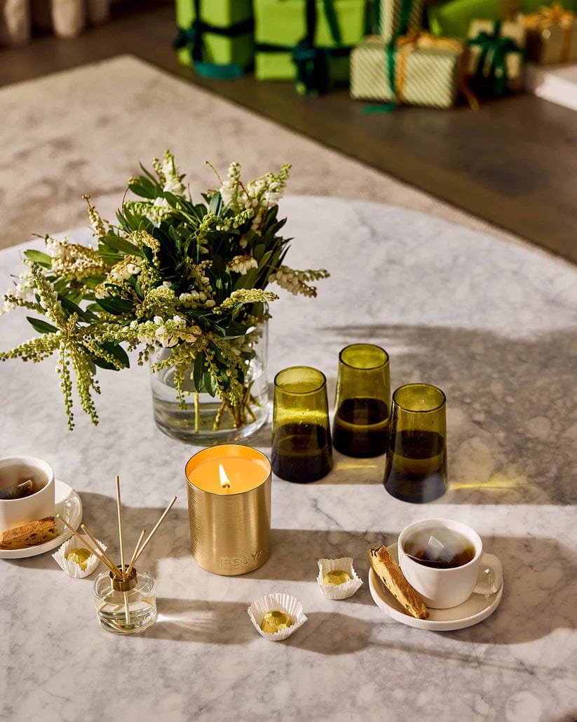The Goldie Candle has been designed with luxury and celebration in mind. Our Holiday Collection fragrances are poured into a covetable brushed aluminium gold vessel, a limited edition vessel available for the holiday season. The Goldie Candle provides a delicately scented burn for up to 90 hours.