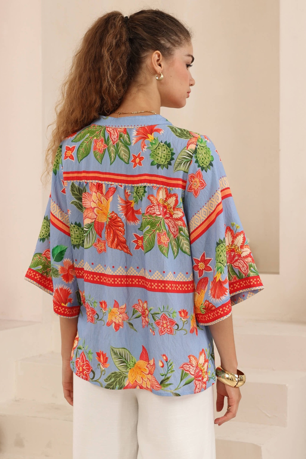 Cut in a regular length with an easy relaxed fit, this boho women’s top works beautifully with denim for casual days, tucked into tailored pants for work, or paired with a maxi skirt for weekends away. For the ultimate coordinated look, style it with the matching Nyra Wide Leg Pants – Blue Floral for an elevated boho set moment.