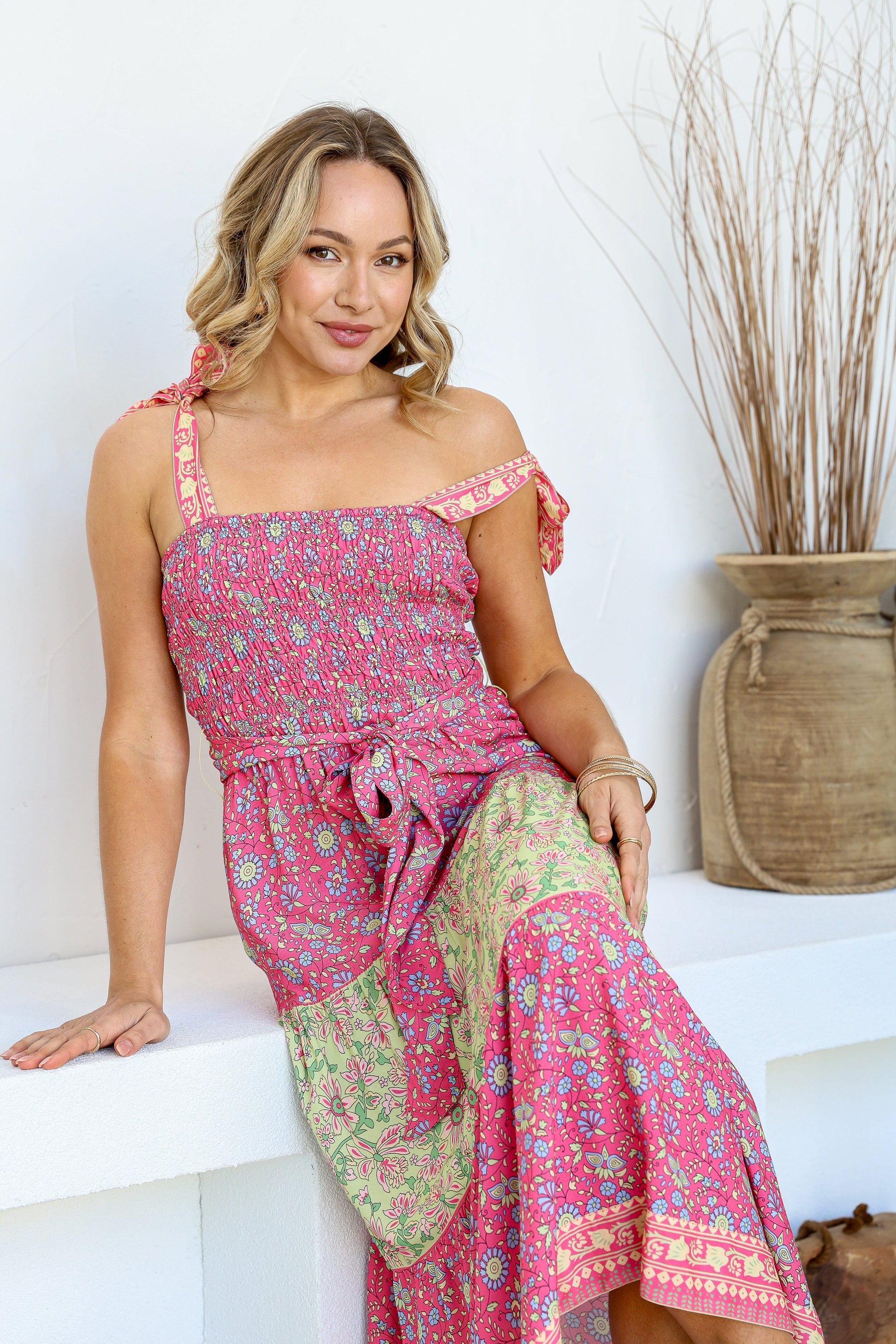 The dress features a charming contrast ditsy floral print, beautifully blending soft green and pink hues. The shirred bust provides a flattering and comfortable fit, enhancing your natural shape while adding a touch of romantic elegance. The shoulder ties add a playful and customizable element, allowing you to adjust the fit to your liking.
